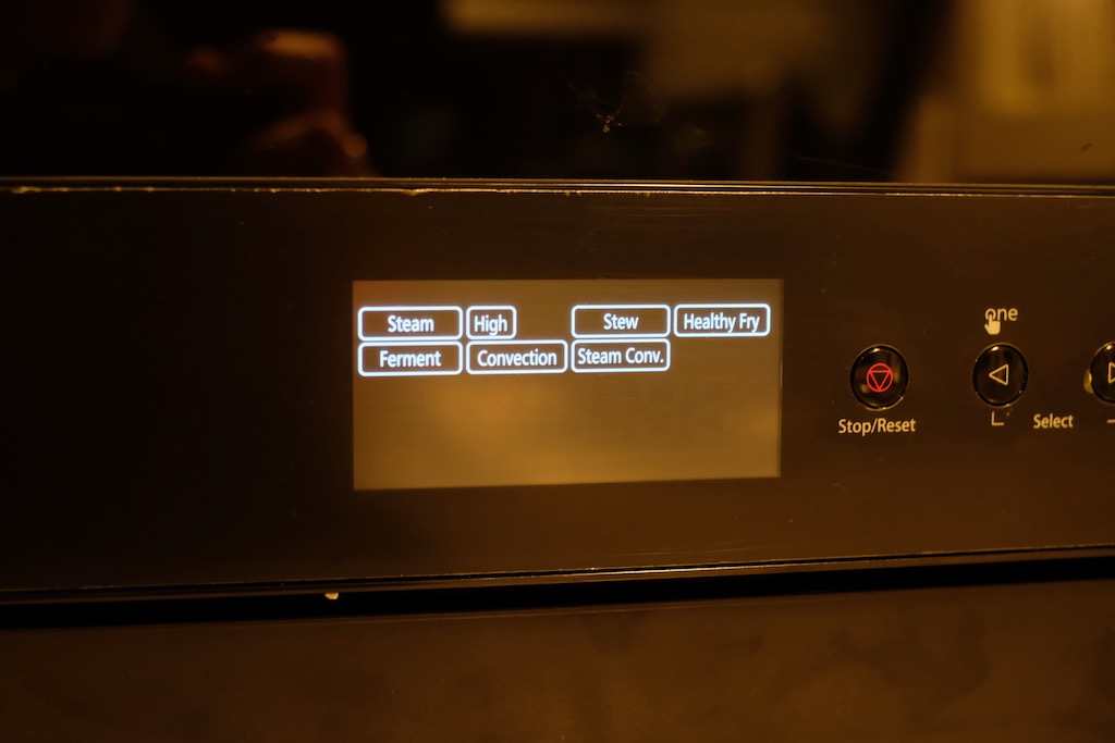 À l’avant, on retrouve les contrôles de l’appareil. Première chose à faire est de sélectionner la façon que vous voulez faire cuire votre nourriture. Ensuite, en appuyant sur Start (un collant est inclus pour mettre les menus en français), on vous demandera si vous désirez faire préchauffer l’appareil ou vous voulez l’utiliser tout de suite. Il ne vous restera qu’à attendre que votre mets soit prêt.
