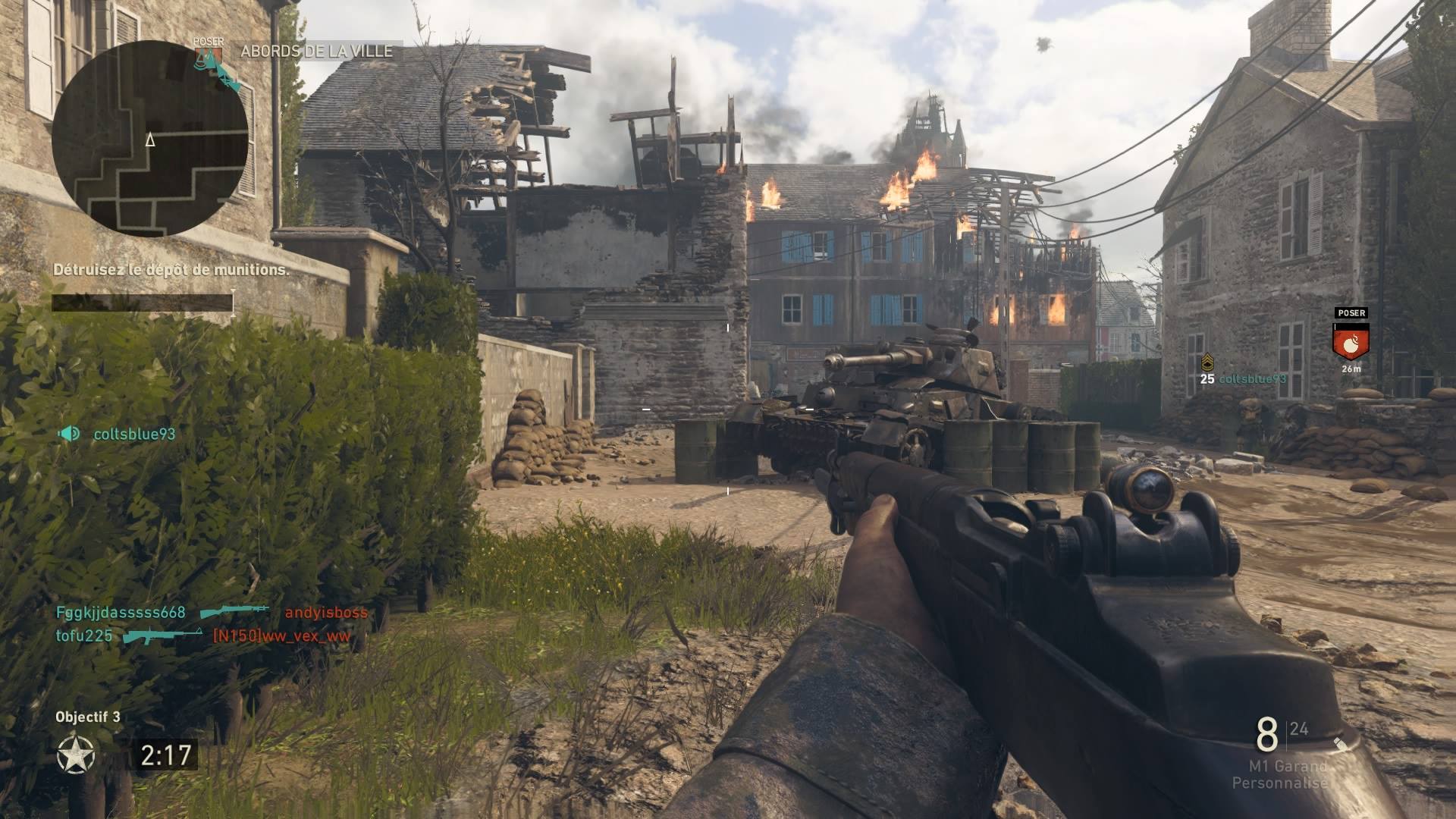 Pour la bêta, il y en a pour tous les goûts. Les matchs durent cinq ou dix minutes pour les Match à mort par équipe, l’épreuve de Point stratégique et le Moshpit. Le mode Domination se termine quand une équipe atteint 200 points et pour les vétérans, vous pouvez carrément partir en Guerre à douze joueurs où pointage et chrono sont illimités. Ce dernier est une nouvelle entrée dans le multijoueur de Call of Duty et s’inspire de la bataille de Saint-Lô ayant eu lieu en juillet 1944.