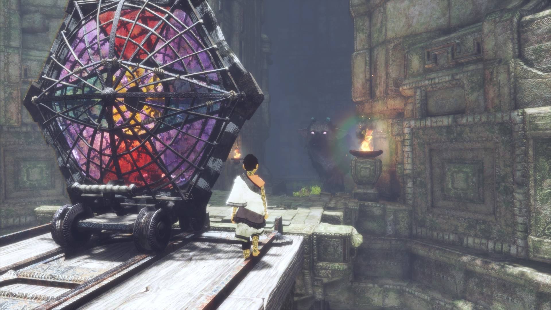 Les contrôles ne sont pas instinctifs au départ car les commandes sont totalement différentes de celles dont on est habitués sur PlayStation 4. Il faut réapprendre à sauter, se pencher ou frapper. On escalade des murs, saute sur des caisses, trouve l’espace caché pour passer derrière une barrière. Dans la peau du garçon il faut s’assurer que Trico puisse nous suivre. Trouver le mécanisme qui ouvrira la porte pour elle fait partie de plusieurs énigmes à résoudre. On parcourt des ruines dont il faut sortir, pour ensuite grimper sur des plateformes aériennes vertigineuses. L’exécution laisse parfois une certaine frustration. Je suis tombée dans le vide souvent et recommencer devient une habitude. On doit également apprendre à s’accrocher au plumage de Trico, ce qui demande en soi une certaine dextérité.