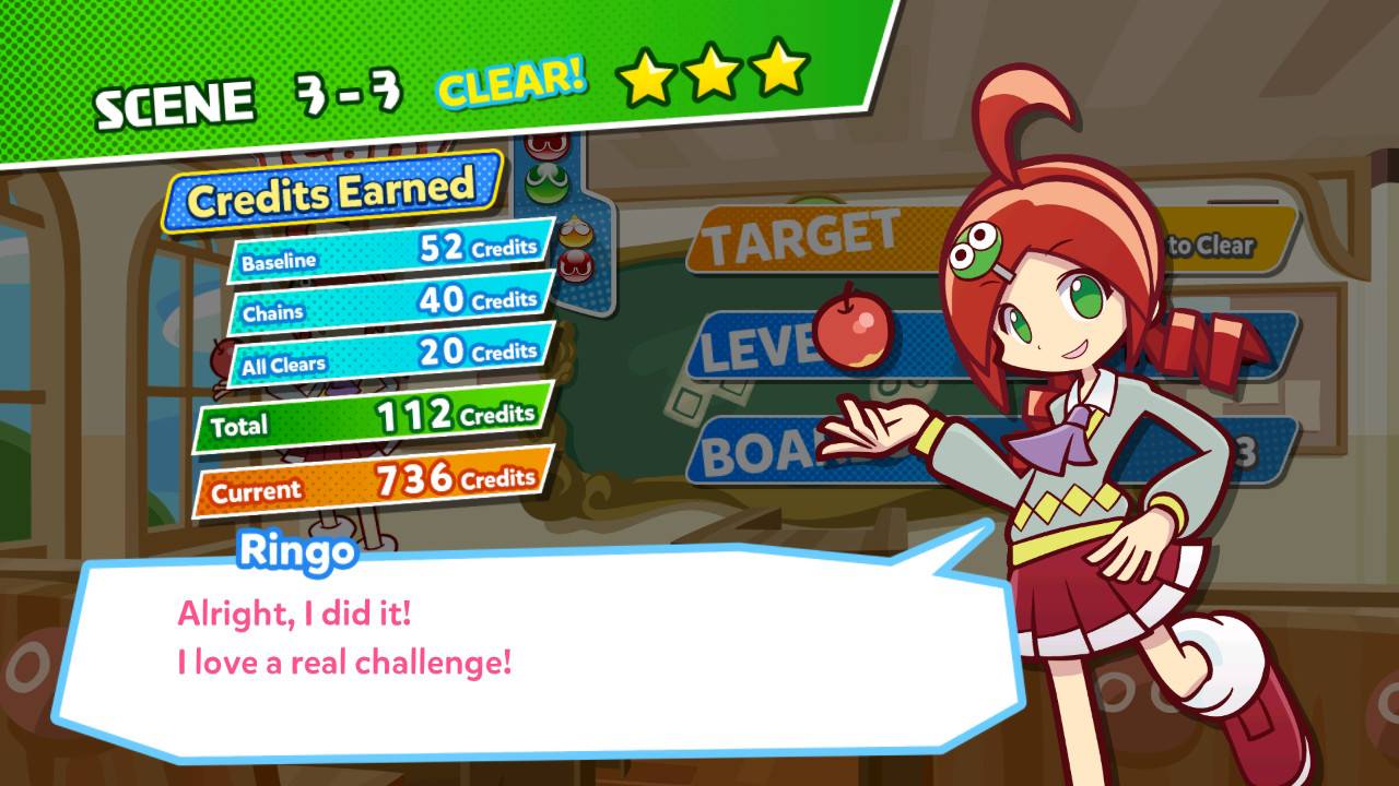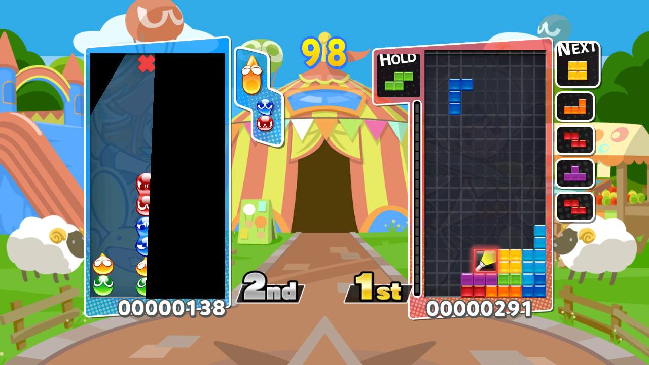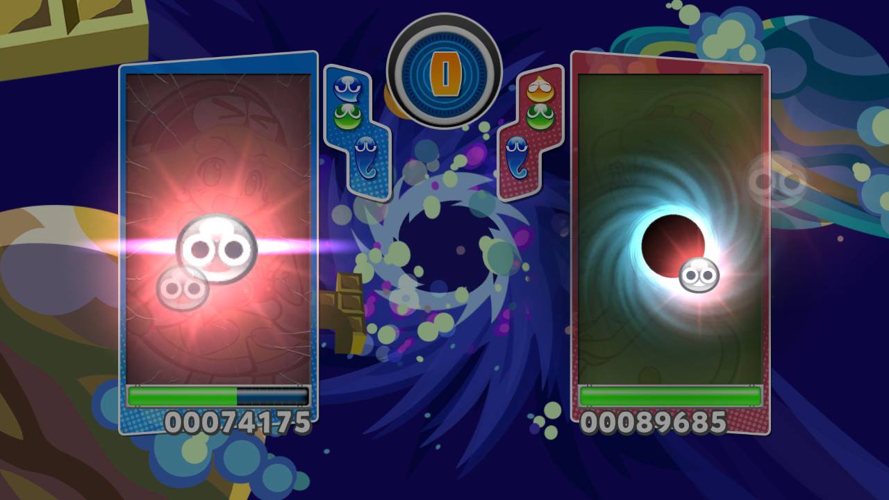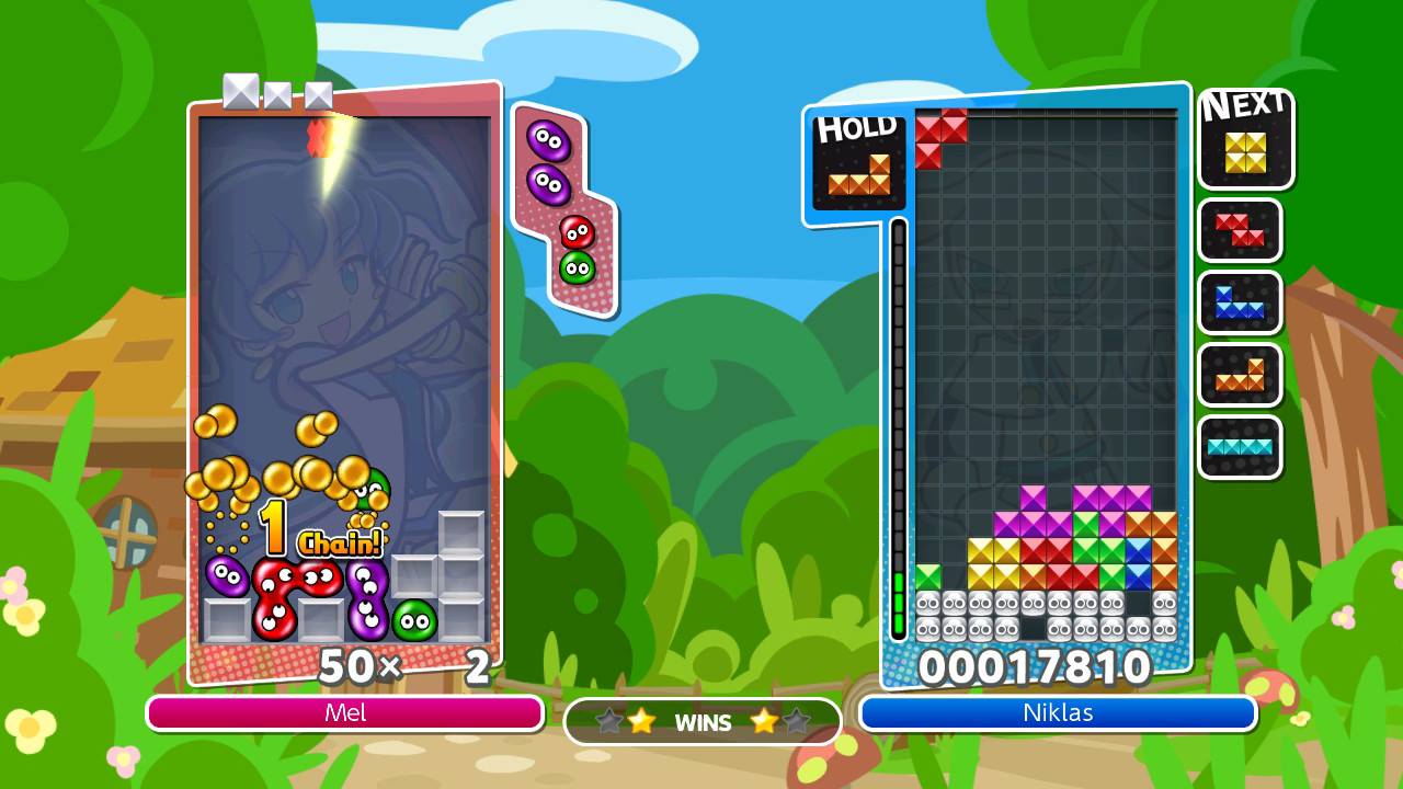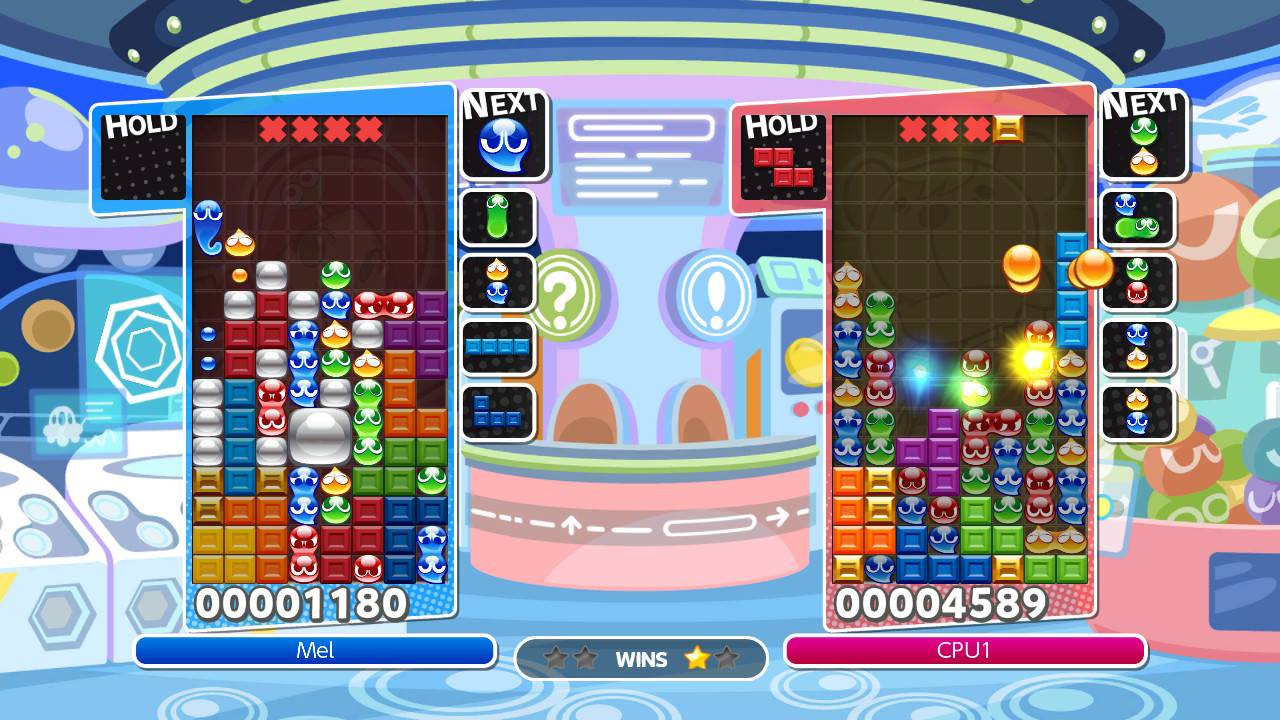 Si vous n’êtes pas familiers avec les jeux Puyo Puyo et Tetris, voici rapidement en quoi ils consistent. Un objet à la forme prédéterminée tombe du haut de l’écran et on doit le placer adéquatement pour créer un pattern rendu en bas. Alors que dans Tetris, on complète une ligne pour qu’elle s’efface, Puyo Puyo requiert un minimum de quatre gouttes de la même couleur collées ensemble pour les éliminer. Ces dernières n’ont pas besoin d’être alignées, il faut juste qu’elles se touchent.