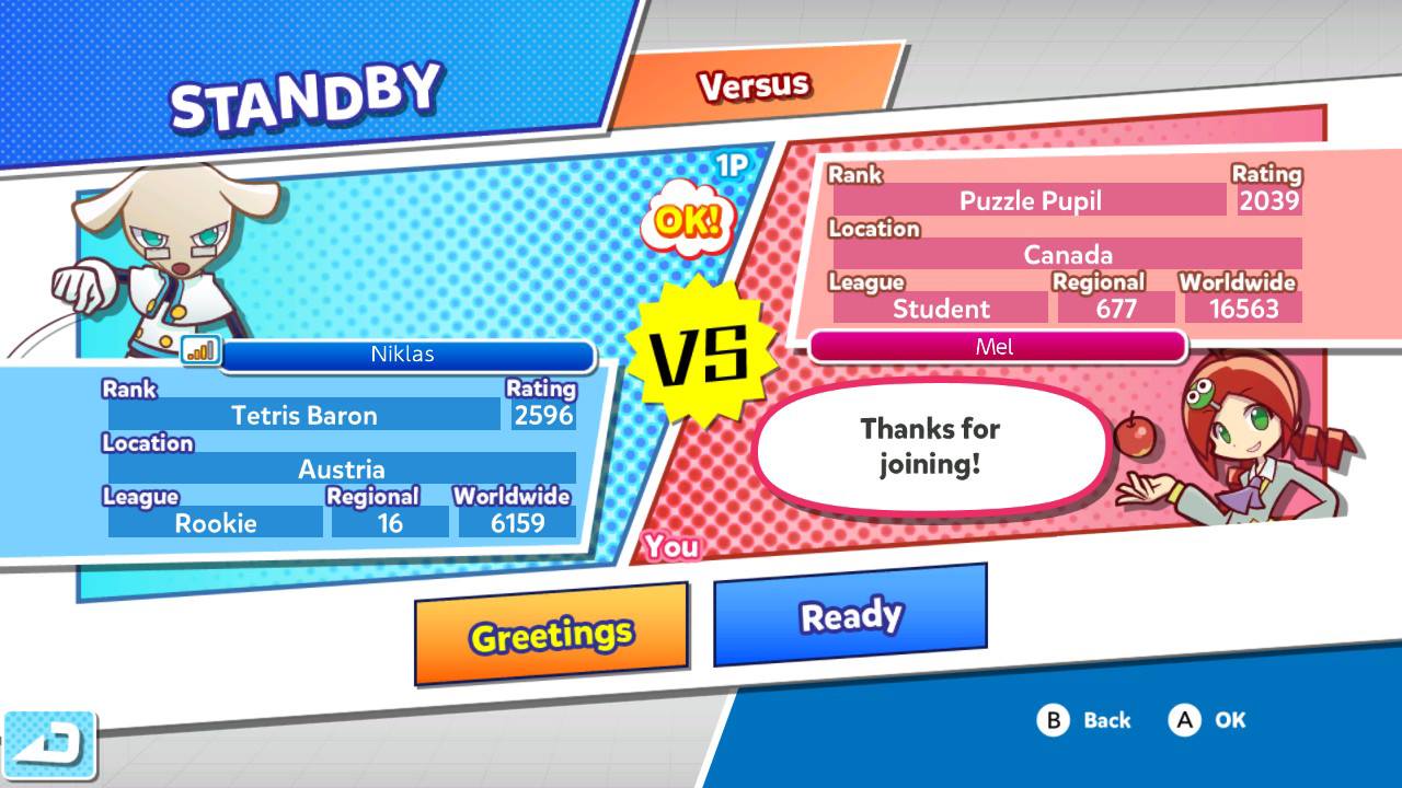 Même si je n’y ai pas trouvé foule en cherchant une partie rapide en ligne, j’ai eu du plaisir lors des matchs de la Puzzle League. Contrairement à d’autres jeux compétitifs où le calibre est tellement fort que c’en est intimidant, ici tout se déroule bien. C’est très cordial avec les bulles d’encouragements qu’on s’envoie en début de partie. Une fois le type de jeu décidé, on sélectionne notre préférence entre Tetris et Puyo Puyo. Pas besoin de prendre la même chose que notre adversaire, ce qui rend chaque expérience unique et le match plus stimulant.