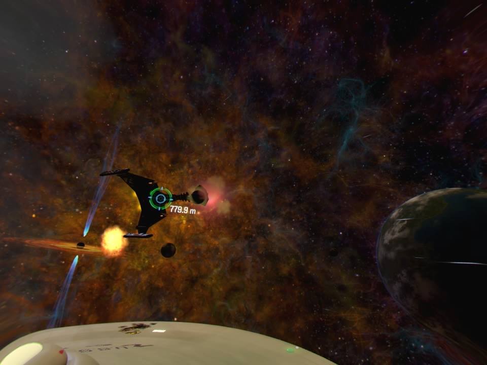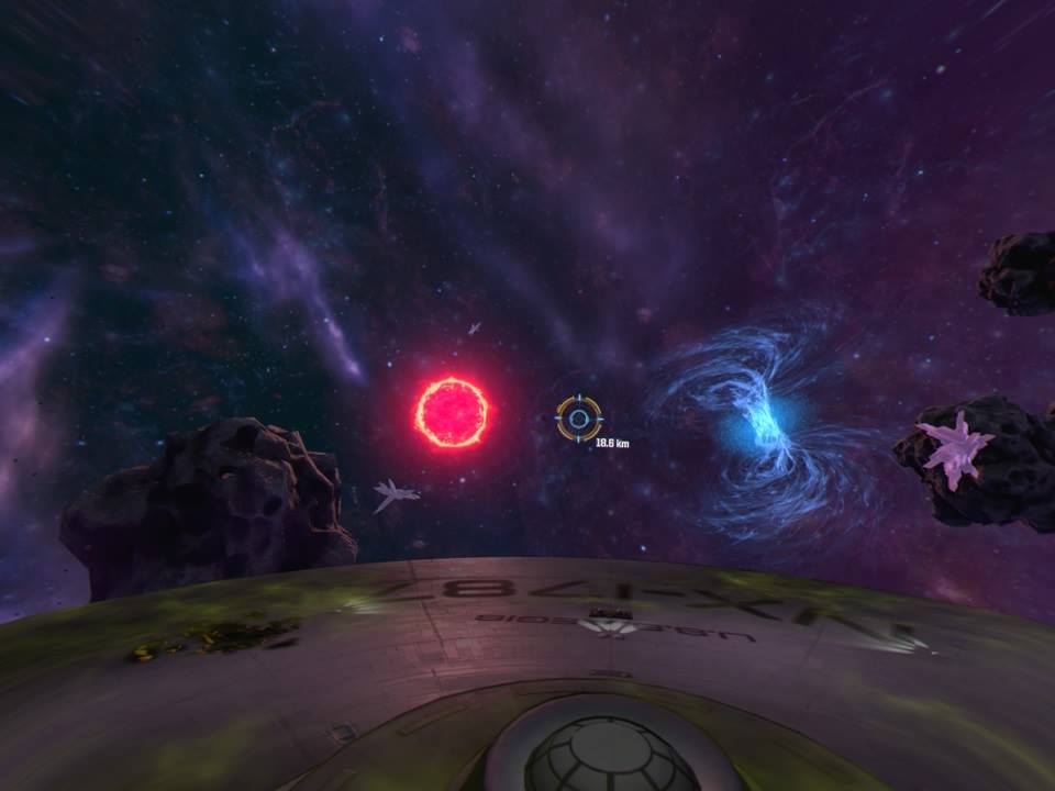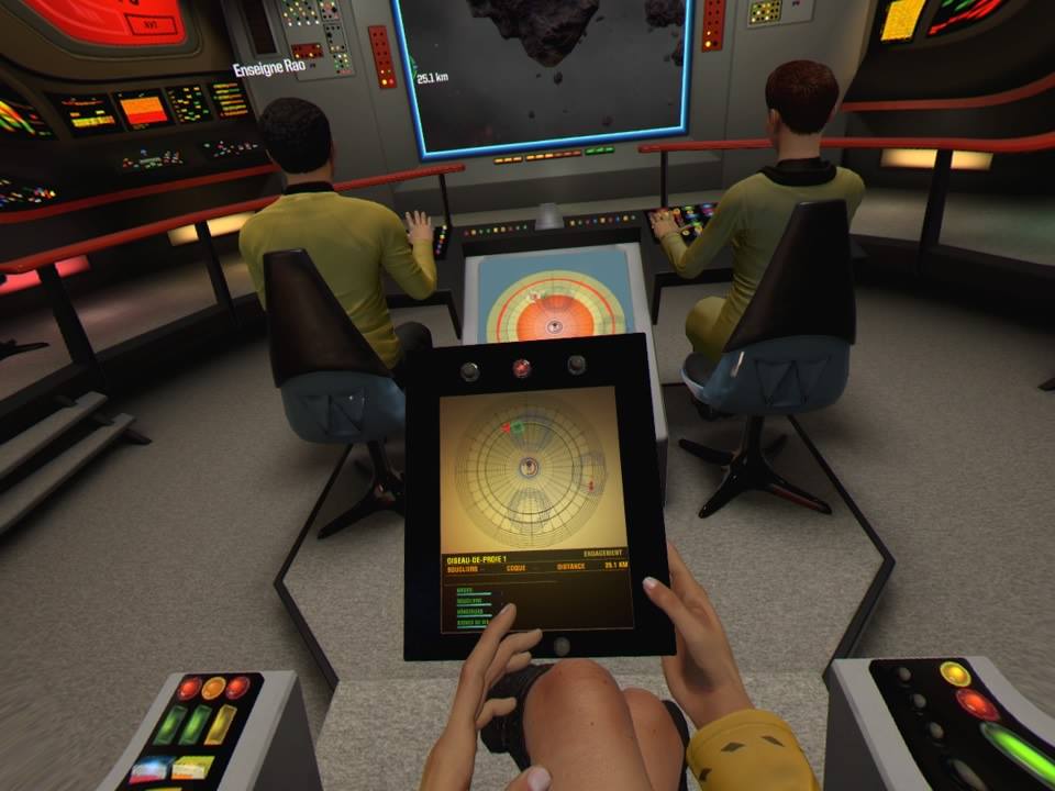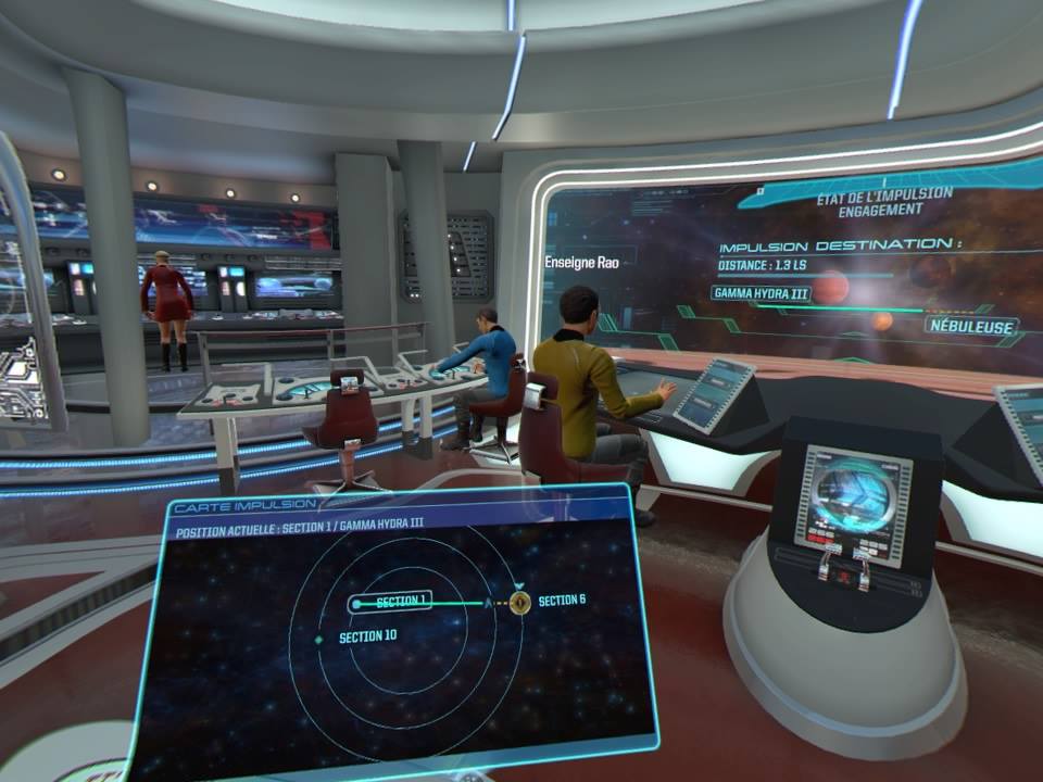 Après environ une heure, j’étais prête pour ma première mission. En solo, on prend le siège du commandant et on suit les missions communiquées par Starfleet. Les panneaux de commande sont placés devant nous alors que notre avatar est assis à son poste. Comme capitaine, j’ai accès au carnet de missions à droite et à la carte de navigation à gauche. Les données analysées par mon officier tactique y sont enregistrées pour ensuite décider de la meilleure approche. En activant le menu d’interaction, je n’ai qu’à tourner la tête vers mes coéquipiers pour leur lancer une commande. Les manettes PS Move permettent de sélectionner l’action souhaitée d’un mouvement de doigt. Elles répondent parfaitement et rapidement.