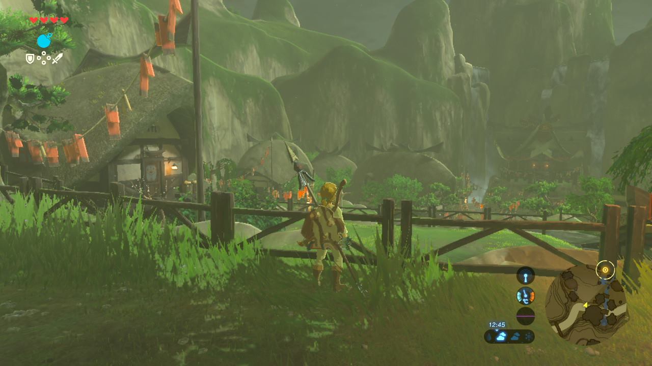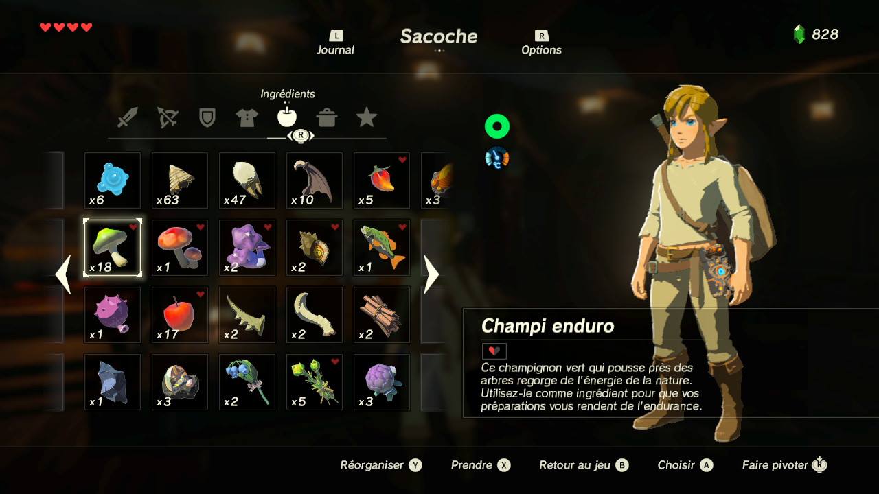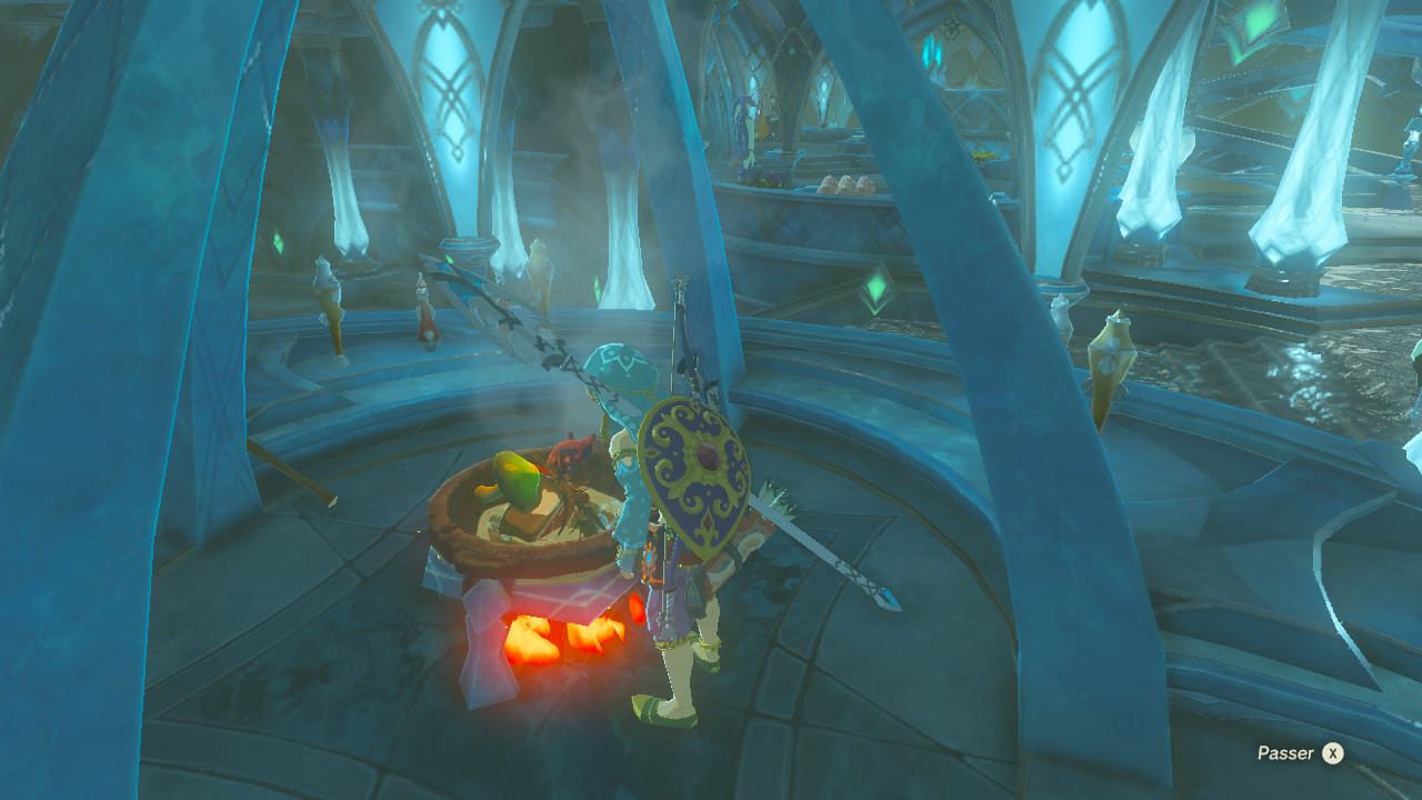 L’autre élément introduit dans Breath of the Wild est la cuisson. Avec tout ce que l’on ramasse en cueillant des herbes, des fruits ou des morceaux de monstres vaincus, on peut cuisiner des recettes comme la brochette de fruits de mer ou une bonne viande rôtie auxquelles s’ajoutent parfois une propriété spéciale. C’est aussi par ces feux de camp que l’on fabrique des remèdes dont mon préféré est celui qui rétablit mon endurance. Si une falaise ou une tour s’avère un peu plus haute que je ne l’avais évaluée, prendre cette concoction d’endurance juste au moment où la jauge arrive au rouge la remplit avec un petit extra.