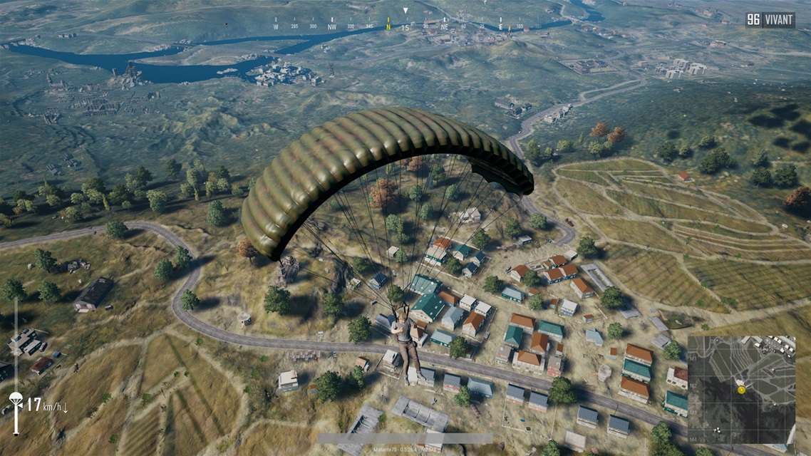 Chaque début de partie commence en avion alors qu’on évalue le meilleur endroit où se parachuter. En regardant autour de nous, on peut apercevoir la trajectoire des joueurs à proximité. Naturellement, je tente de m’en éloigner afin d’atterrir dans un lieu isolé.