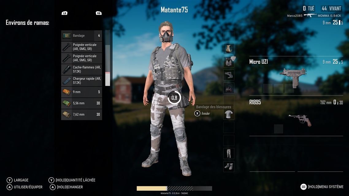 Une fois à terre, on fouille les bâtiments pour s’équiper. Ça nous prend des armes, des munitions, des bandages et des trousses de soin. Un sac à dos permet de transporter davantage d’objets et j’assume que le casque de moto et le gilet pare-balles trouvés par terre vont (peut-être) me protéger des balles ennemies.