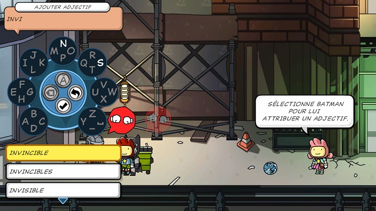 J’ai joué aux premières itérations de Scribblenauts sur la Nintendo DS, puis sur Wii U. L’écran tactile de ces consoles permettaient de taper à l’écran les mots dans le carnet de Maxwell. En évaluant Scribblenauts Mega Pack sur Xbox One, cette mécanique est nécessairement différente. En activant le carnet, les lettres apparaissent à gauche de l’écran. On sélectionne le groupe, puis la lettre choisie une à une avec les boutons de la manette. Après quelques lettres, des mots suggérés apparaissent. Il n’en tient qu’à nous de les sélectionner, ou de continuer à rédiger notre mot pour des suggestions plus précises. Cela se fait étonnament bien, même que j’ai trouvé cette fonction plus facile qu’en tapant sur le clavier virtuel de mes anciennes consoles.