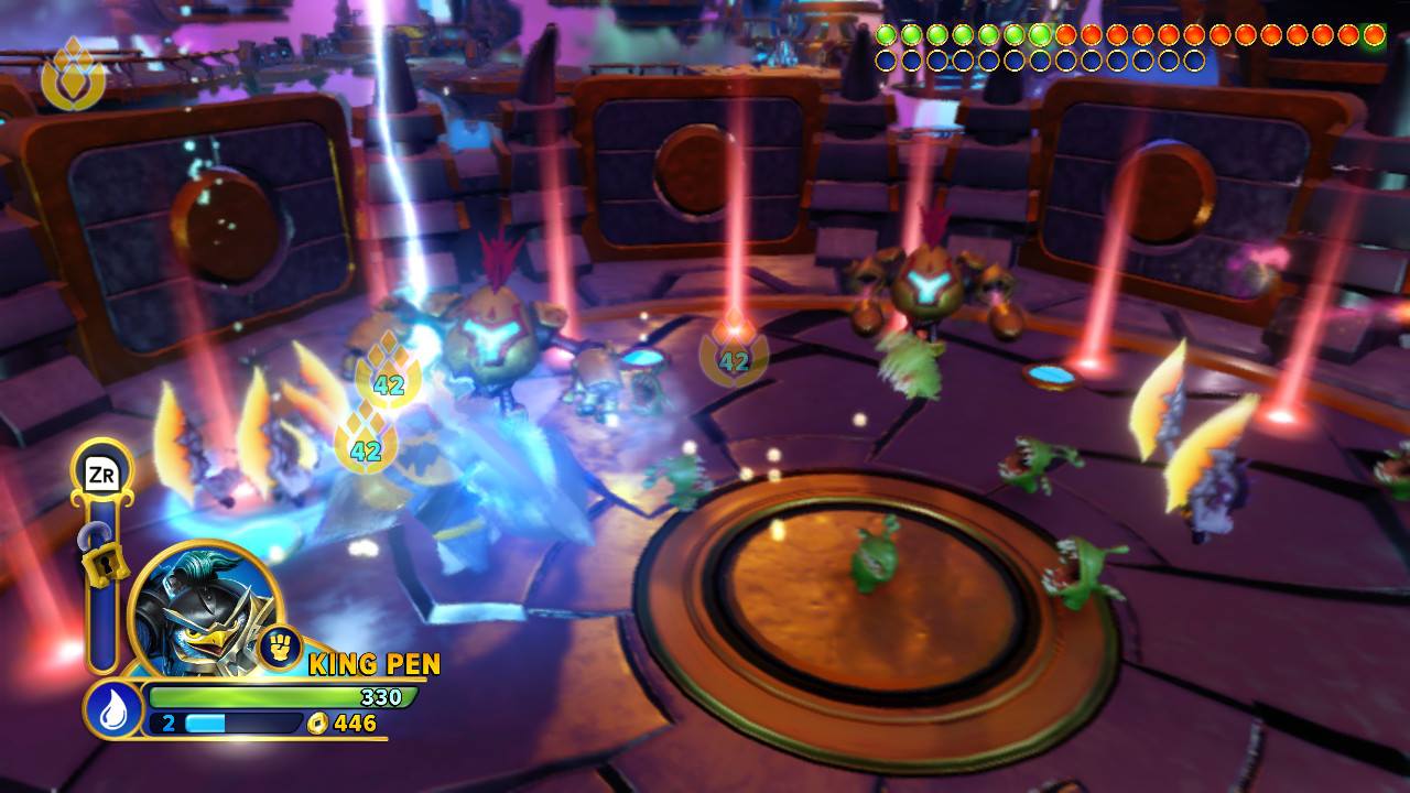 Alors que la plupart des Doomlanders nous attirent dans un combat d’arène, j’ai bien aimé les autres mécaniques du jeu. J’ai glissé sur des rails, fait éclater des ballons, me suis envolée vers des plateaux éloignés et plané autour d’une île pour détruire une masse de guacamole. Je n’ai ressenti que très peu la séparation entre la portion jouable et l’intégration des animations. Par contre, ceci se fait au détriment de longs temps de chargement chaque fois qu’on entre dans un tableau ou même dans certaines pièces.