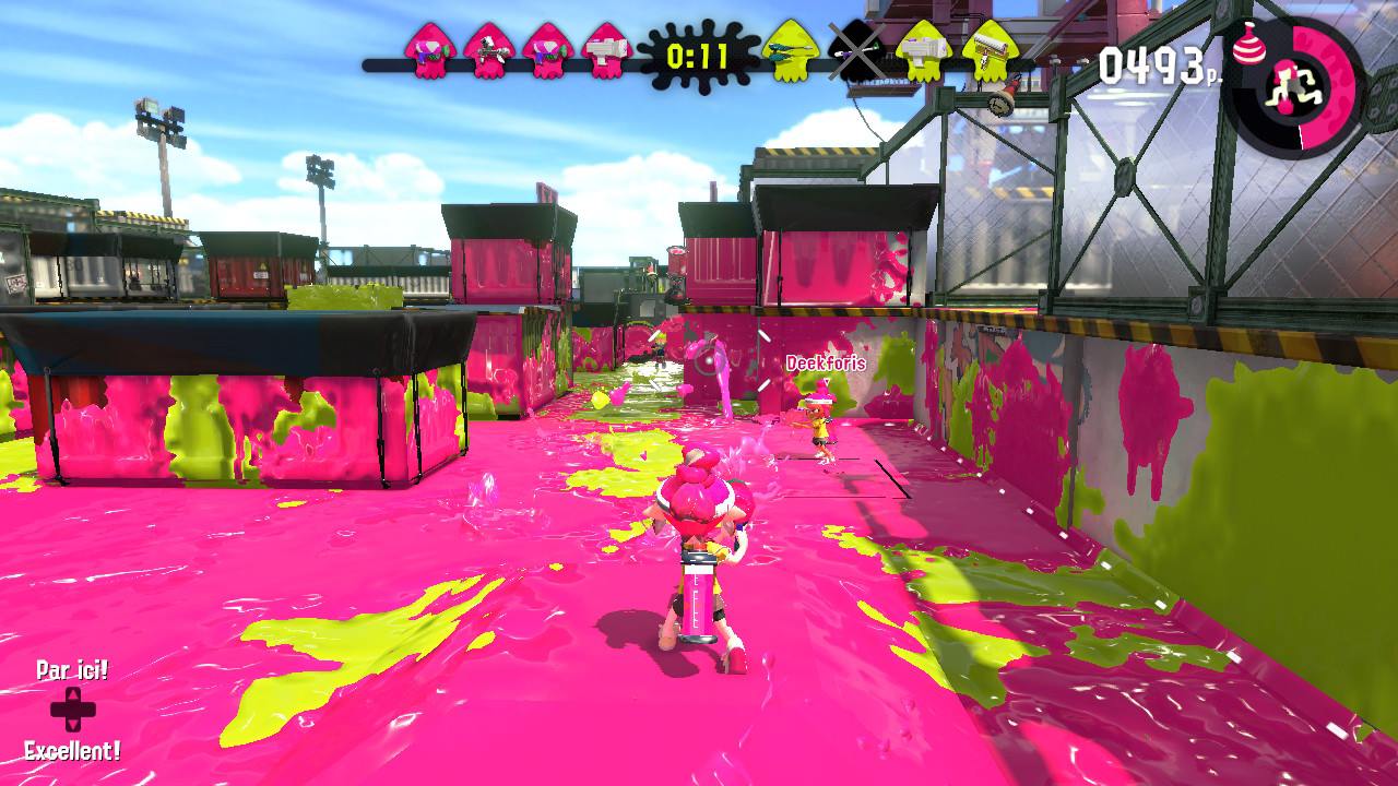 La musique est entraînante et se mélange parfaitement aux jets lancés par notre armement. On s’entend plonger et nager dans l’encre, le tout de manière dynamique et amusante. Remarquez également le mouvement de bras de Coralie sur la console qui suit parfaitement la musique quand elle décrit les arènes multijoueur en vedette avec sa collègue Perle.