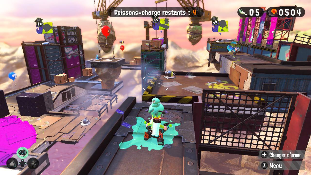 C’est également avec ce mode solo qu’on va essayer les armes une à une. Les octariens nous attendent de pied ferme et les objets mis en place nous entraînent à naviguer en toutes circonstances. J’ai vraiment du plaisir à sauter sur les tapis roulants, nager dans les éponges géantes gorgées d’encre, éviter le regard des robots-aspirateurs et glisser sur les câbles électriques. Même si j’étais chronométrée pour atteindre le Poisson-Charge de chaque fin de niveau, je prenais quand même mon temps pour faire éclater toutes les caisses remplies d’œufs de poisson et aller chercher les objets spéciaux à collectionner.