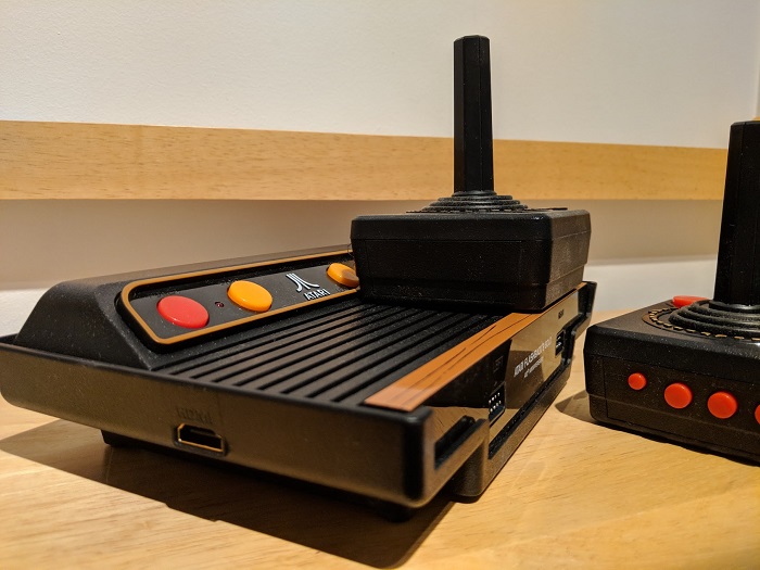 La première chose que l’on constate en ouvrant la boîte est la légèreté de la console. Faite en plastique, elle a tout de même l’air solide. La texture lignée sur le dessus et un appliqué en imitation de bois rappelle la console Atari 2600. Les boutons sur l’appareil comprennent l’alimentation, Start, Select et deux boutons pour ajuster la difficulté des jeux par joueur.