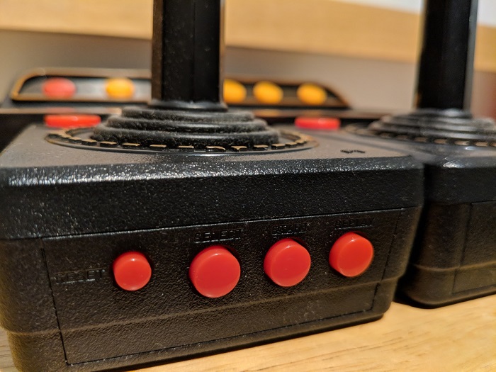 Les manettes fournies ressemblent beaucoup aux originales, mis à part les boutons rouges sur le panneau avant de celle du joueur 1. Elles sont alimentées par deux piles AAA mais il est possible d’y brancher deux autres manettes avec fils devant la console. Certains jeux pouvant être joués en multijoueur à quatre, AtGames a pensé à eux.