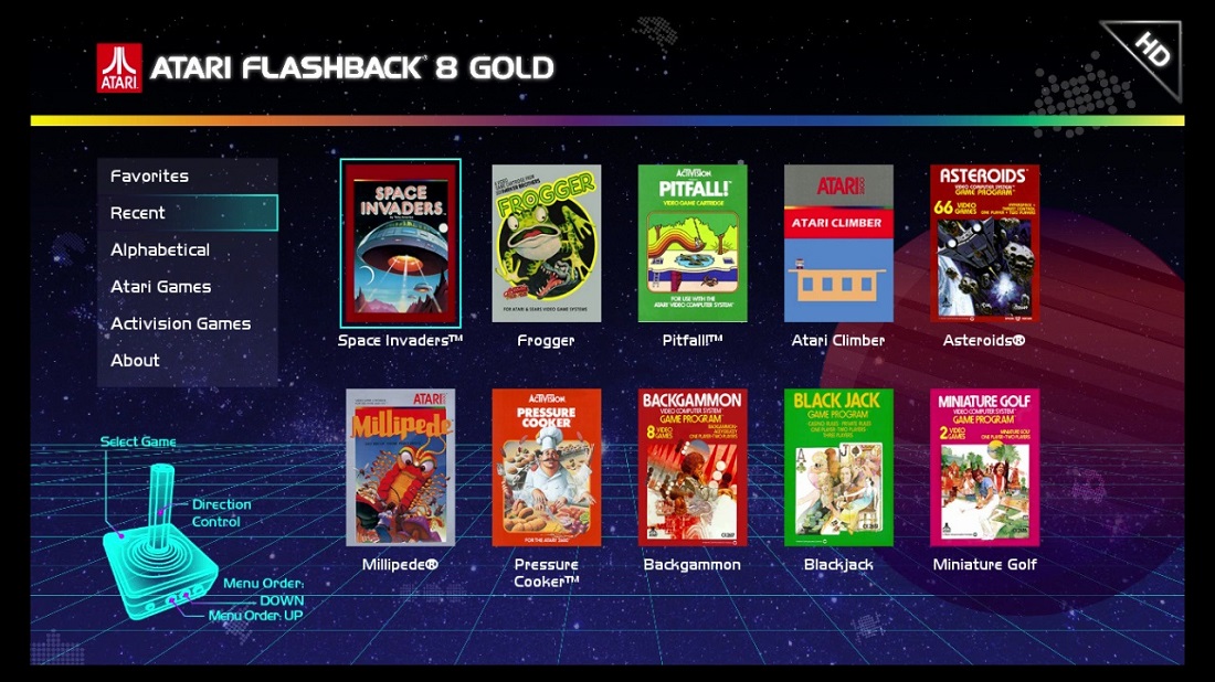 Ce qui est bien avec les consoles actuelles est qu’elles sont faciles à installer pour y jouer en quelques secondes. L’Atari Flashback 8 Gold n’en fait pas exception. Une fois sortie de la boîte, je n’ai eu qu’à brancher l’alimentation, le câble HDMI de la console à mon téléviseur et installer des piles dans les manettes. Les jeux sont accessibles directement du menu principal sans rien avoir à télécharger. Ils sont classés par ordre alphabétique, ou encore par catégorie, soit Atari et Activision. Avec toute cette sélection, je me suis fait une liste de favoris où mes jeux préférés y sont accessibles facilement.