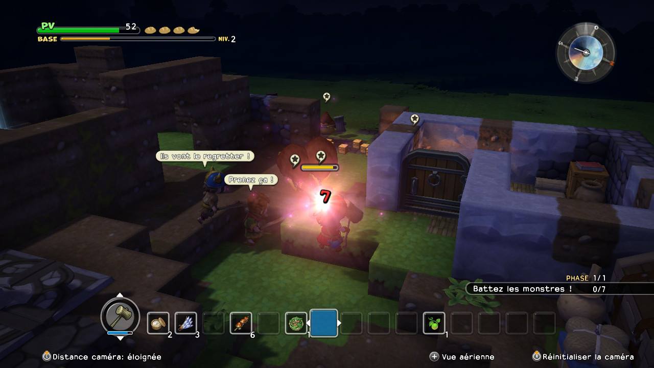 En jouant à Dragon Quest Buiders, je n’ai pu m’empêcher de comparer mon expérience avec LEGO Worlds et Minecraft. Là où ces derniers me faisaient décrocher au fil du temps, Dragon Quest Builders réussit à me captiver. L’histoire générale est assez légère mais ça bouge tout le temps. J’ai toujours une mission en cours, ce qui garde ma motivation. Les quêtes à remplir et les combats de monstres lancés en marge de mes objectifs de bâtisseur comblent mon besoin de direction. Sa grande liberté d’action permet à chacun d’y trouver ce qu’il aime faire. Certains pourraient se concentrer à construire, explorer et collecter des ressources alors que d’autres aimeront se battre contre des monstres. Il suffit de sortir du village pour en croiser de toutes les tailles. Peu importe vos goûts, vous en aurez pour des heures à parcourir Alefgard.
