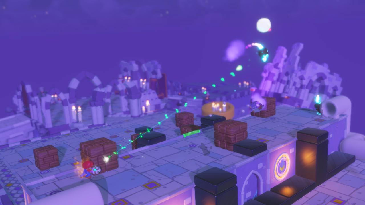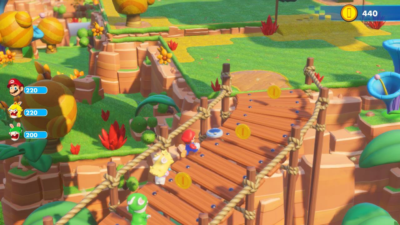 Visuellement, Mario + The Lapins Crétins : Kingdom Battle est sans faille. Les Lapins ont envahi le royaume et on les aperçoit partout où l’on regarde en train de s’amuser… ou installés dans une situation un peu fâcheuse. Seulement en combat, j’aurais aimé pouvoir mieux contrôler ma caméra. Alors que je tente de placer mes personnages à l’endroit idéal pour frapper, j’avais parfois de la difficulté à voir si j’étais bien positionnée pour l’ennemi que je souhaite viser. Au niveau sonore, c’est dynamique. Chaque monde a son thème et la multitude de sons entendue prouve que le royaume est vivant.