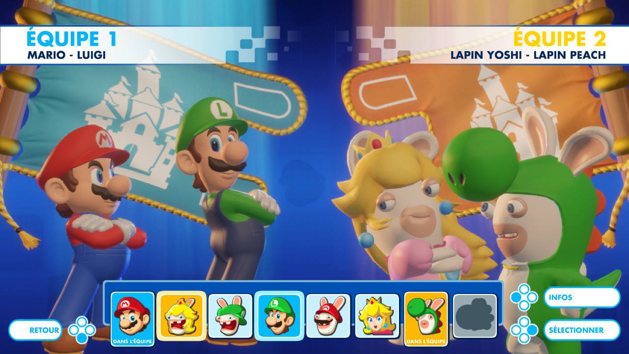 Victime de la corruption du casque, Spawny transforme les Lapins aux couleurs des personnages du royaume Champignon. Ceux déguisés en Mario, Luigi, Peach et Yoshi seront nos alliés alors que les autres prennent le camp ennemi. On les affronte dans une arène de combat stratégique en mode tour par tour. Fidèle au royaume Champignon, le terrain est parsemé de cubes en brique derrière lesquels on peut s’abriter et on atteint les plateformes élevées ou éloignées en passant à l’intérieur des tuyaux.