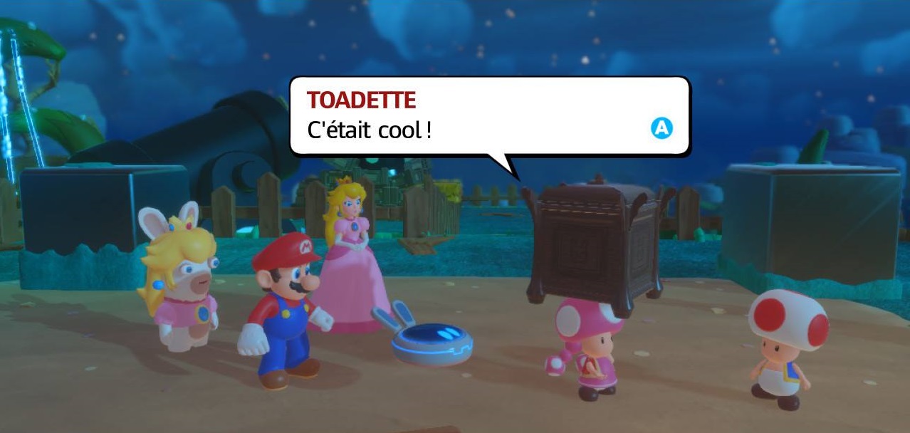 Pour l’ensemble, c’est une réelle lettre d’amour que Ubisoft lance à Nintendo. On y aperçoit des artéfacts partout et les voix de nos personnages préférés sont interprétés par les artistes habituels. À cause de l’invasion des Lapins Crétins, le royaume est en piteux état mais on rit souvent. Voyez ce qu’ils ont fait !