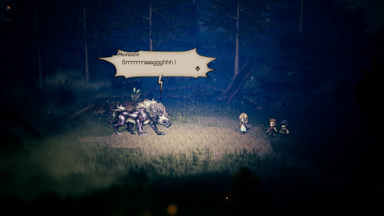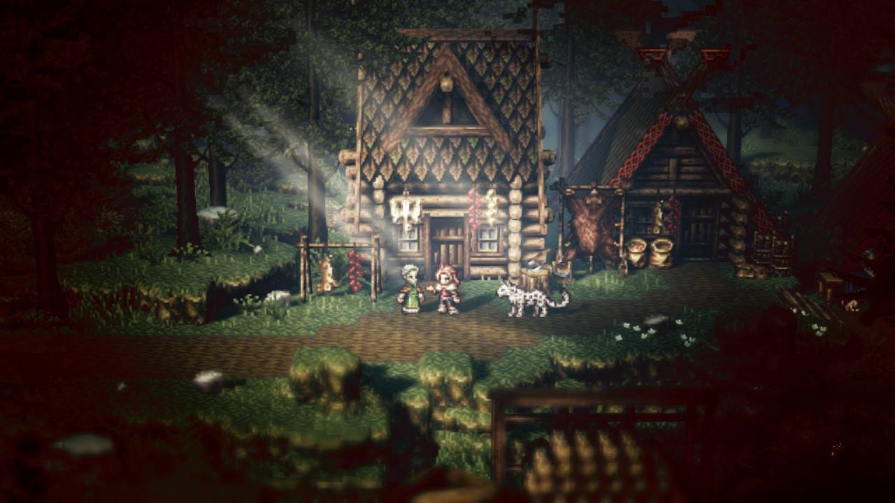 Octopath Traveler s’inspire des jeux de rôle japonais traditionnels. On y reconnaît la facture graphique léchée au niveau des animations et une musique symphonique que je pourrais réécouter sans cesse. Dans la portion jouable, les personnages sont pixélisés mais assez détaillés pour les reconnaître parmi les autres villageois. Orsterra est un pays immense aux environnements diversifiés, si bien que nos héros parcourront la forêt, le désert et le froid des régions nordiques.