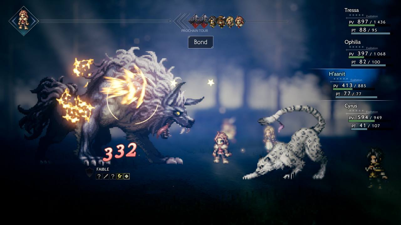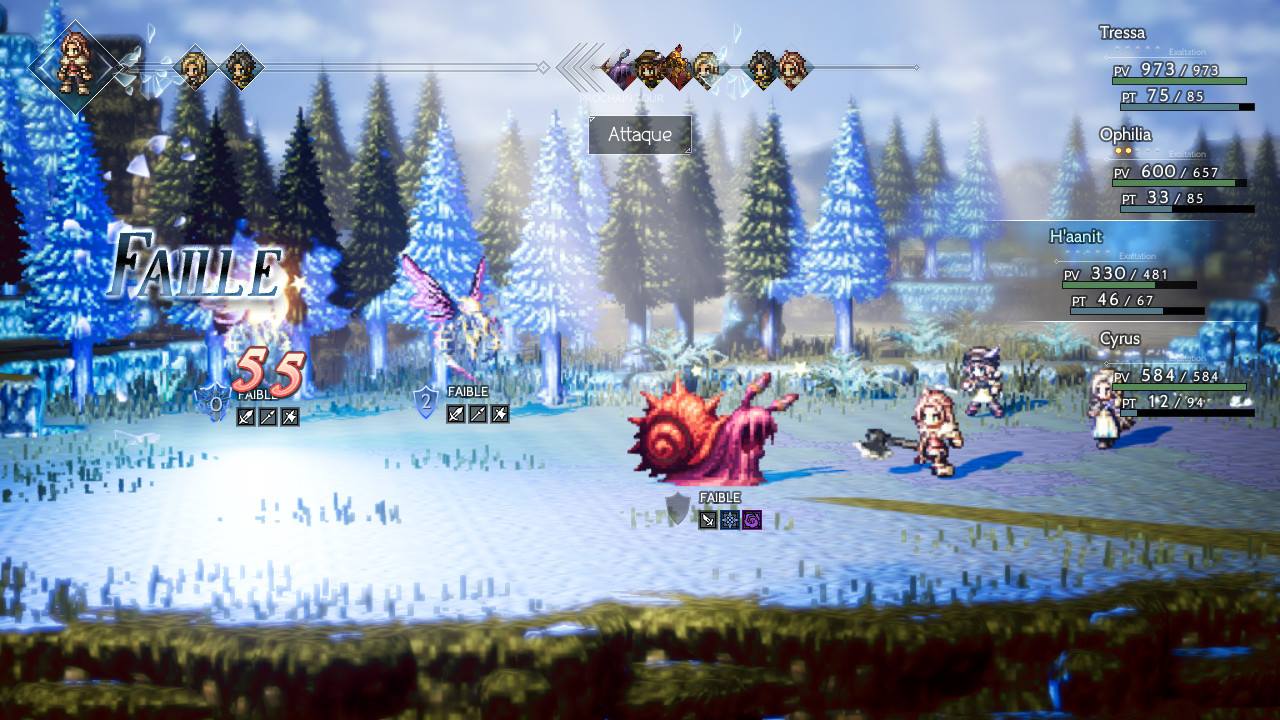 Des monstres nous affrontent au hasard, dont la puissance s’accroît selon le lieu visité. Ça prend une bonne équipe avec des personnages complémentaires pour vaincre les plus puissants. Parce que nos ennemis n’ont aucune pitié contre nous, j’ai particulièrement apprécié la mécanique stratégique des combats. En trouvant la faille de nos ennemis, on les affaiblit. Il faut aussi utiliser l’exaltation au bon moment, qui lance une attaque double. Si on réussit notre coup, il est même possible de sauter le tour de l’ennemi pour une riposte efficace.