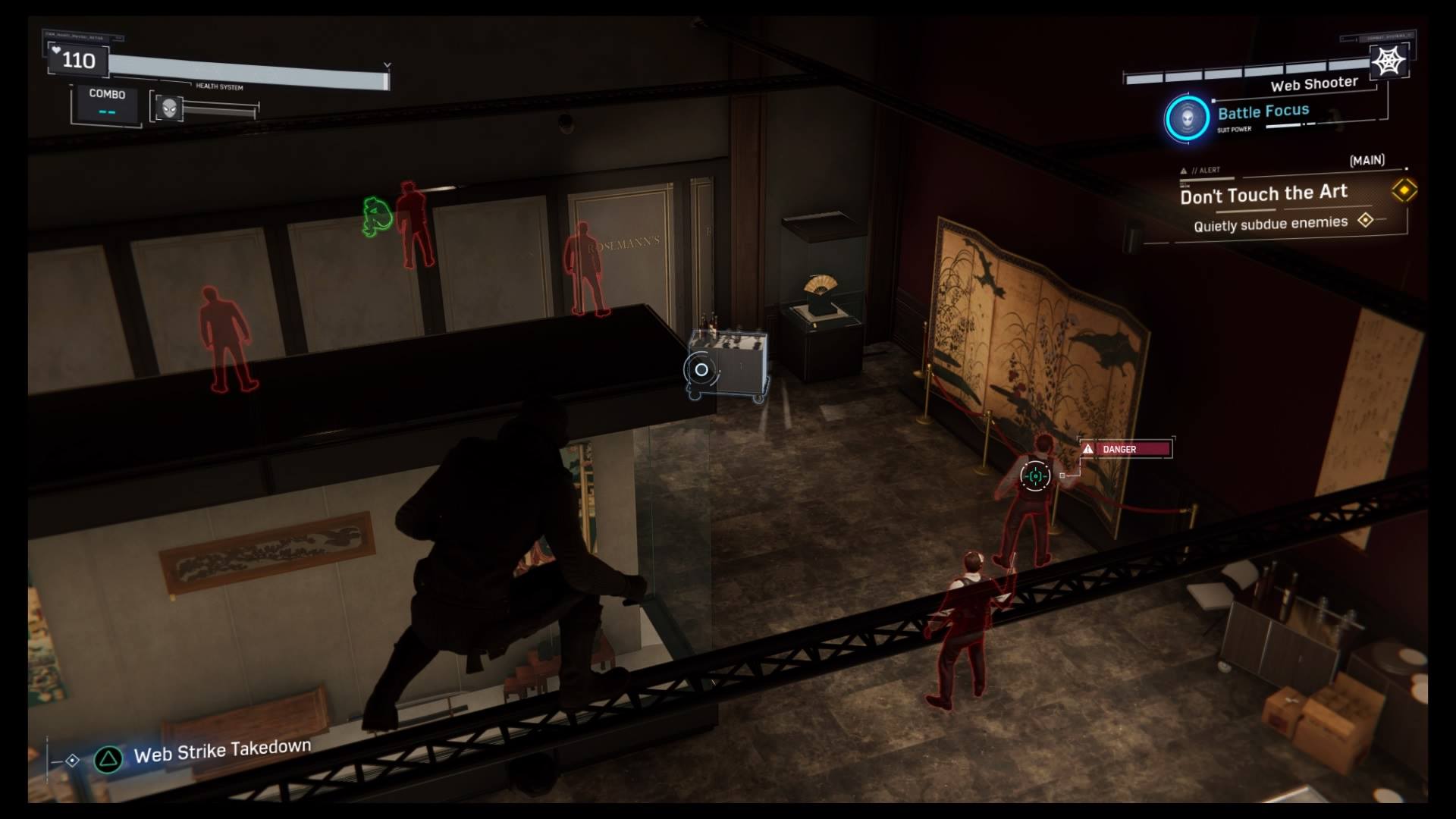 Je me suis beaucoup amusée à parcourir la ville en me balançant sur ma toile, m’accrochant aux édifices et autres objets installés en ville, si bien que je n’ai jamais utilisé la téléportation! La mécanique est naturelle et s’exécute très bien. On a d’ailleurs amplement le temps de s’entraîner car on bouge constamment.