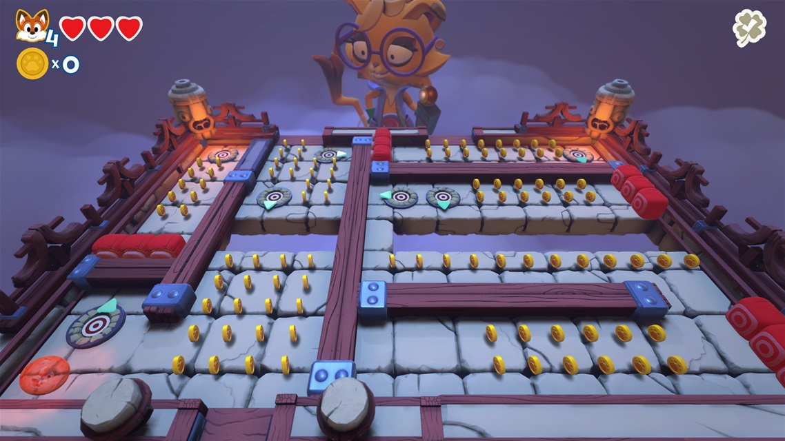Voir les animaux s’animer et les pièces dorées réapparaître en revenant dans la région de base me rappellent que Super Lucky’s Tale est d’abord destiné aux enfants. Les portails donnant accès aux tableaux sont déverrouillés un à un. Sur le seuil de chacun, une couleur s’allume quand on a réussi le défi associé. Ils correspondent à terminer le tableau, récupérer les cinq lettres épelant L-U-C-K-Y, ramasser tous les diamants et trouver le trèfle supplémentaire caché derrière un défi additionnel dans le tableau. La porte donnant accès au gardien requiert un nombre minimal de trèfles. Si le premier monde est allé rondement, pour le second, j’ai dû refaire quelques anciens tableaux afin de trouver les trèfles qui manquaient. Cette mécanique nous oblige à répéter les mêmes niveaux, en particulier lorsqu’on avance plus loin dans le jeu.