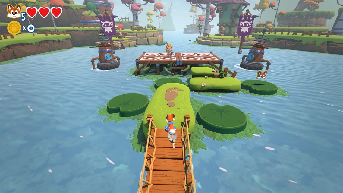 Les bornes de sauvegarde situées dans le parcours vont nous aider mais je trouve dommage de n’avoir que cinq vies pour mon personnage. On arrive à en avoir en bonus en récupérant un écusson à l’effigie de Lucky dans certains tableaux mais ils sont rares. Bien que je sente l’inspiration des développeurs prises dans d’autres jeux du genre, je me serais attendue qu’au nombre de pièces collectées (j’en possède des centaines!), elles auraient pu me permettre d’augmenter mon nombre de vies. Ceci ne m’empêche pas de progresser de manière générale mais cela devient lassant de reprendre tout un tableau que j’avais presque terminé une fois ma dernière vie épuisée suite à une chute fatale. Les mondes flottent dans les nuages alors les chutes malencontreuses arrivent souvent. Malgré tout, je n’ai pas abandonné et ma persévérance m’a permis de passer un bon moment.