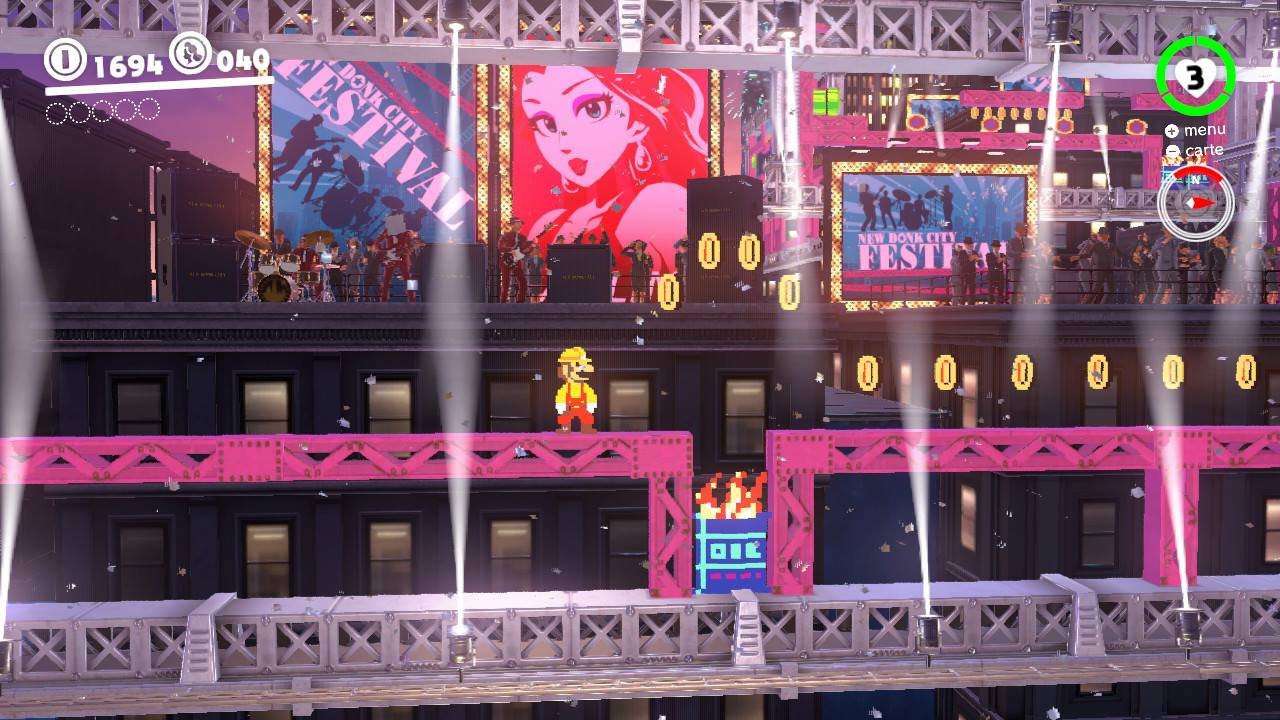 Parmi mes activités favorites, faire une portion de tableau rétro est en tête de liste. Si vous apercevez l’entrée d’un tuyau vert, allez-y ! Vous serez propulsé dans un mini-jeu où Mario doit progresser en format 8-bit sur une surface en 2D. Le tableau à l’apogée du festival organisé par la mairesse de New Donk City est fantastique à cet égard. Faisant des clins d’œil à d’autres séries de Nintendo, Super Mario Odyssey balance le tout à la perfection.