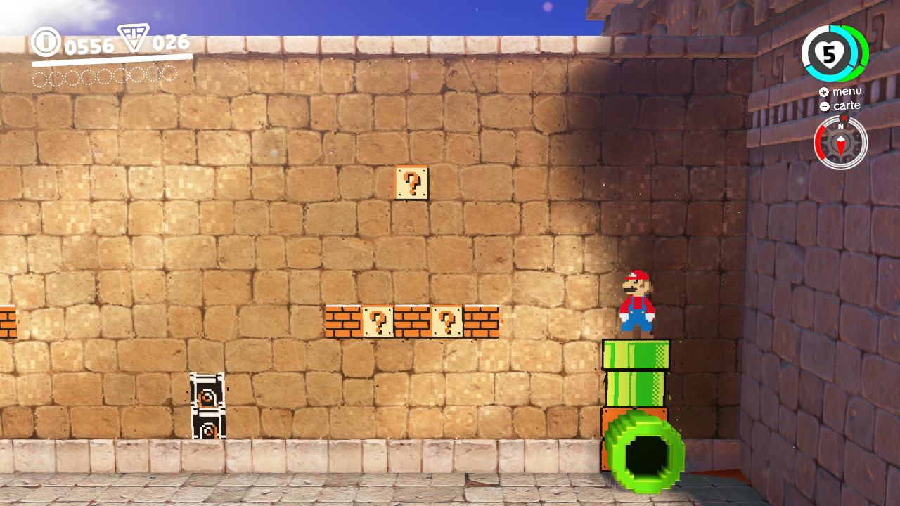 En développant son jeu, Nintendo pense à tout le monde. Alors que les habitués ont tout le loisir d’explorer le royaume à la recherche des dizaines de lunes cachées dans chaque pays, les nouveaux arrivants peuvent profiter du mode assisté. En plus de bénéficier de six cœurs au départ, des flèches les aide à se diriger dans les tableaux et une bulle ramène Mario au sol quand il tombe dans un ravin.